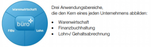 büro+ – Die Kaufmännische Software gliedert sich in 3 Anwendungsbereiche, die Sie in Ihrem Unternehmen wieder finden: Es sind die ModuleAuftragsverwaltung/Warenwirtschaft (kurz: Auftrag), Finanzbuchhaltung (kurz: FiBu) und Lohn-/Gehaltsabrechnung (kurz: Lohn).